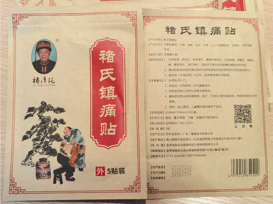 主要功效:褚氏镇痛贴是一款疗效神奇的瑶族医药药贴,针对亚健康人群和痛症患者,对颈椎病、肩周炎、骨质增生、腰椎间盘突出、风湿骨病、滑膜炎、骨刺扎痛、腰肌劳损、跌打骨折、四肢关节病引起的疼痛起辅助治疗作用。