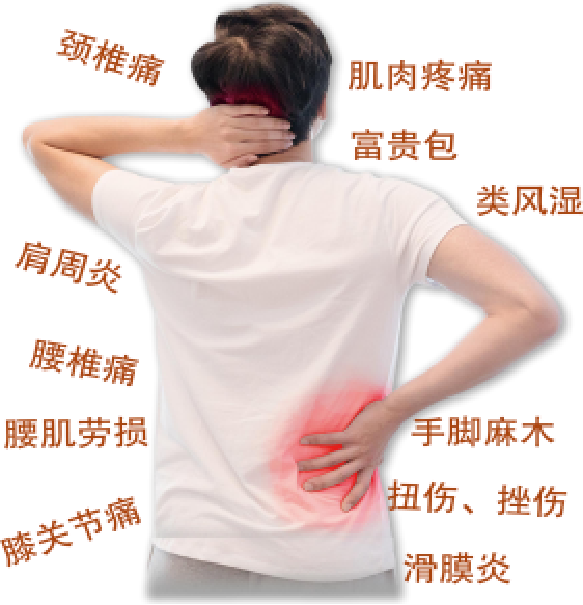 【适宜人群】:适宜于闭合性软组织损伤引起的疼痛、肿胀、麻木、扭伤、挫伤的部 位(颈椎、肩周、腰椎、滑膜、关节、足跟、风湿、颈肩腰腿等)等不适的人群。